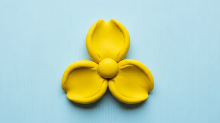 Intriguing Contrast: Vibrant Yellow Tri-spinner Fidget Toy Shines on Captivating Blue Tabletop --ar