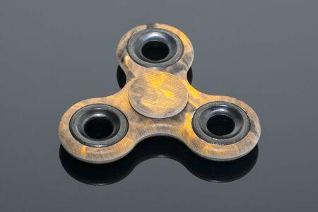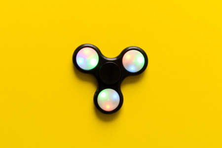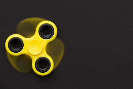 Rotating yellow fidget spinner device on black background. Top view. Playing with a yellow hand spinner fidget toy