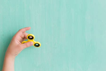 Child's hand spinning a fidget spinner device on turquoise background. Top view. Playing with a yellow hand spinner fidget toy