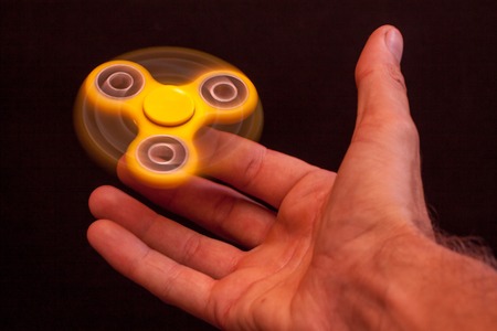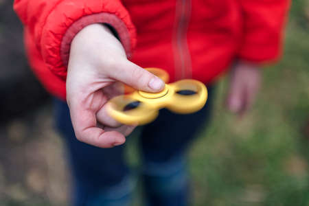 Child's hand spinning a fidget spinner device. Playing with a yellow hand spinner fidget toy