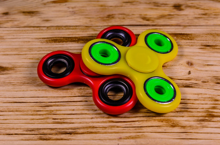 Group of fidget spinner stress relieving toy on a old wooden background.