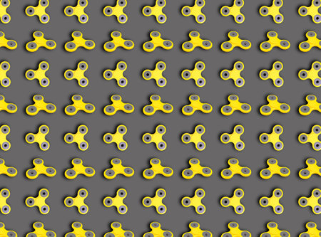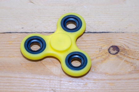 Close up top view photo of popular yellow fidget spinner, stress relieving toy against grey wooden background