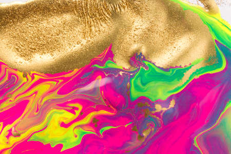 Gold dust spots on liquid fluorescent paints on white background.