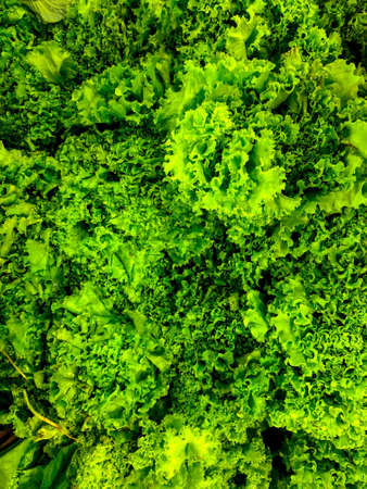 Closeup of a bunch of fresh, organic green salad, lettuce made without nitrates in the market for fruit and vegetables. Concept health, agriculturally.