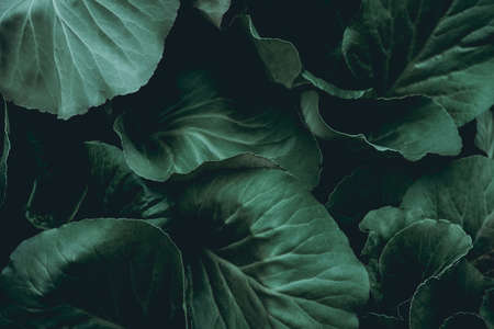 Deep faded green leaves background. Creative layout. Toned image filter. Black and green.