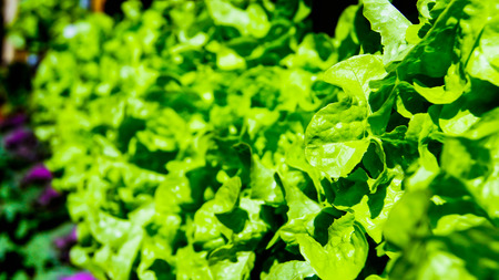 Gardening background with many lettuce green plants. Green leaf lettuce on garden bed in vegetable field.