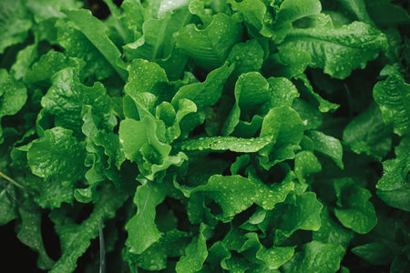 Lettuce leaves with water drops top view. Salad in urban organic garden. Homestead lifestyle. Gardening wallpaper or banner