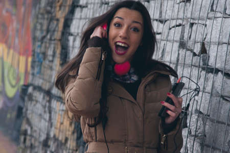 girl on the street with headphones listening to music and dancing
