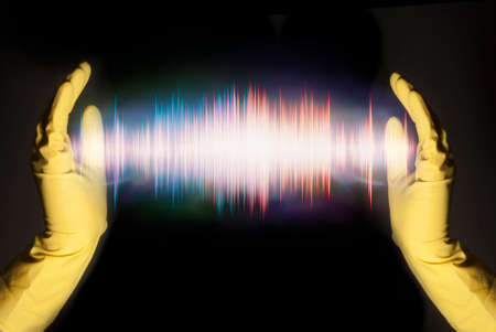 Two hands in yellow rubber gloves with electricity arcing between them