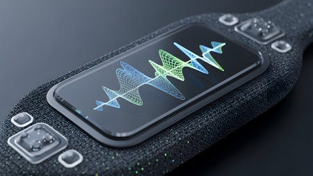 A close-up of a futuristic wearable device with a glowing screen displaying a digital waveform...