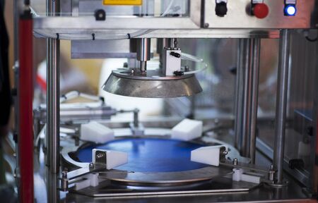 Automated production line factory complex no products manufacturing closeup. Metal electrical conveyor spinning empty machine at technological storehouse. Mechanical industrial workplace concept