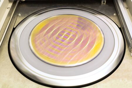 A microchip silicon wafer cleaning process that rotates at high speed. The substrate is blurred.Silicon Wafers with microchips - used in electronics for the fabrication of integrated circuits.Color silicon wafers with glare.