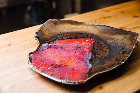 Stone curl color white and gray platter on conrete table, top view mockup. Plate Diy made of cement streaks, scratches and cracks. Space for text. Selective soft focus.