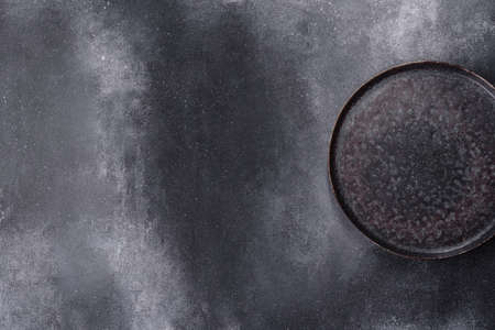 Empty black ceramic plate On a concrete background. Top view with copy space