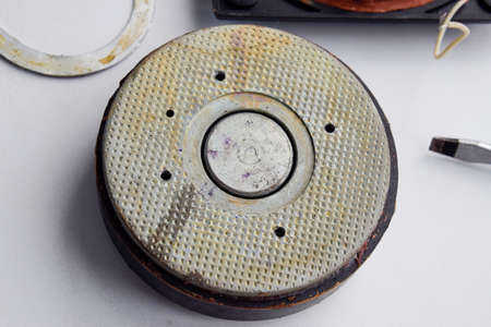 Speaker repair, disassembled speaker. High-frequency speaker on a white background. A component of a three-way speaker system.