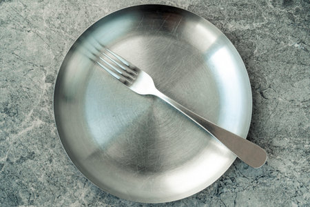 Empty steel metal plate with a fork. Kitchen utensils on grey marble table. Top view flat lay.