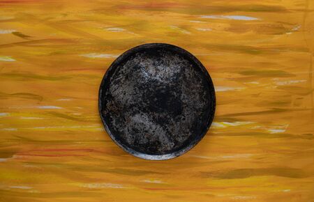 Modern empty round brown ceramic plate on yellow background. Top view. Selective focus. Copy space.