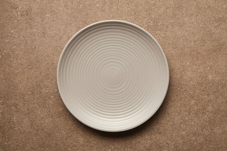 Beautiful empty round ceramic plate on a concrete background. Kitchen utensils for serving food on the table