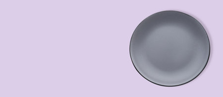 Empty gray ceramic plate on violet background, top view and space for text. banner design
