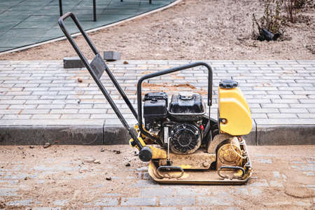 Vibratory rammer with vibrating plate on a construction site. Compaction of the soil before laying paving slabs. Close-up