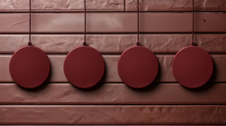 brown round red and black pendants are clipped to a rope on the wall, showcasing a color field minimalism style. the maroon, technological design, and social commentary plaques create a captivating kitchen still life. this outdoor art adds a festive atmosphere to any space. ai generated