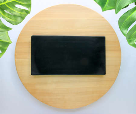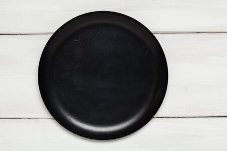 Empty black ceramic plate on wooden background dark tone, copy space.