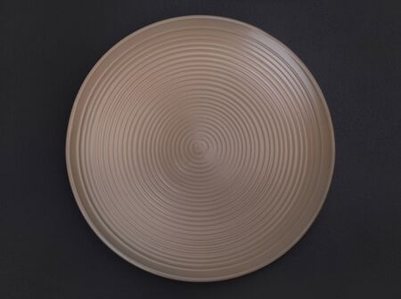 Empty brown colored ceramic plate on dark textured concrete background. kitchen utensils