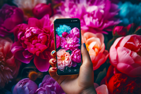 Person taking picture of bunch of flowers with cell phone. Generative AI.