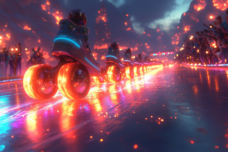 A captivating image of white roller skates with glowing wheels set against a mesmerizing blue light. The smooth surface reflects the vibrant colors, creating an energetic and lively atmosphere ideal for sports and leisure activities.