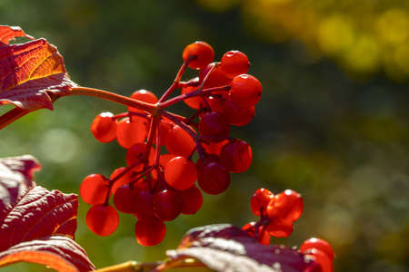 Viburnum berry on a branch in the sun. A bunch of red berries on a branch. Golden autumn harvesting