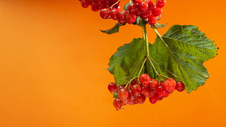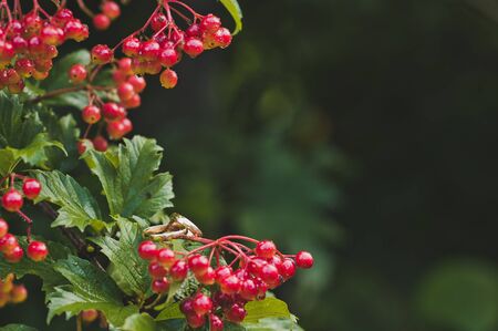 Clusters of red Viburnum berries on green leaves background.Natural summer, autumn pattern. Web banner.