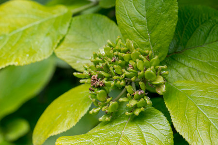 green buds of viburnum gordovina on a green blurred background. close-up. natural lighting. Viburnum lantana. Viburnum. Viburnaceae. wayfaring tree. mealy tree. sheep berry. Viburnum prunifolium