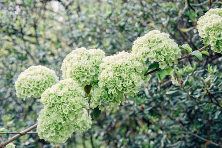 fresh blooming green and white flowers ball buds viburnum Buldenezh close-up on tree branches background, horizontal outdoors stock photo image photography wallpaper