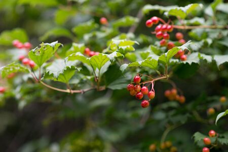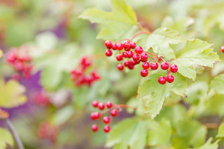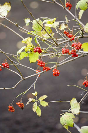 Red berries of viburnum on the branches of a bush in the garden. Blurred autumn background