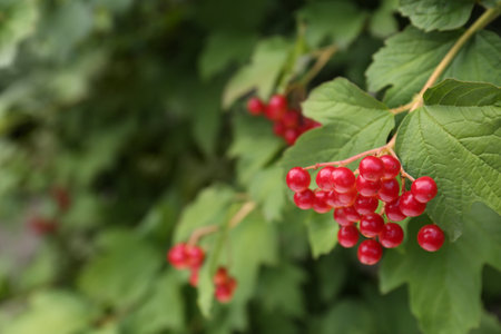 Beautiful Viburnum shrub with bright berries growing outdoors, closeup. Space for text