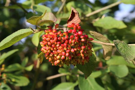 In the summer, viburnum is whole-leaved (Viburnum lantana) berries are ripening