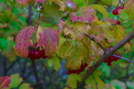 Red viburnum berries on a bush with autumn leaves, selective focus