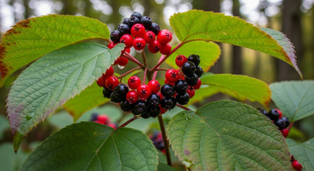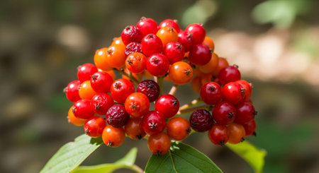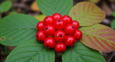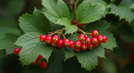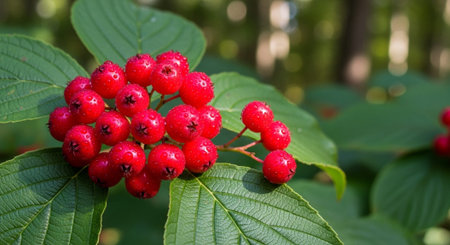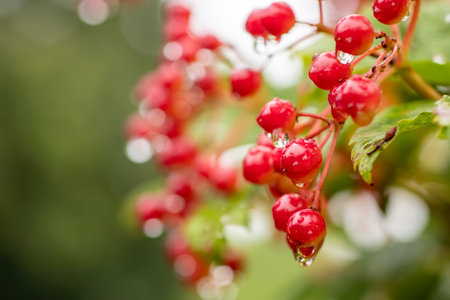 Bright red viburnum berries clustered on a bush, captured in close-up, showcasing natural textures and vibrant colors