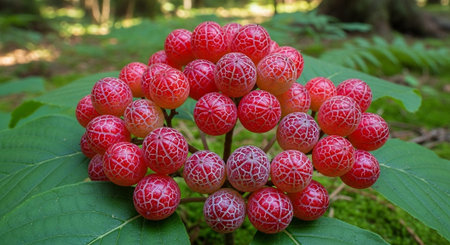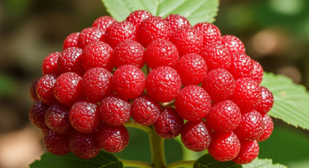 Close-up view of vibrant red berries nestled among lush green leaves, set against a serene mountain backdrop, showcasing nature's beauty and freshness.