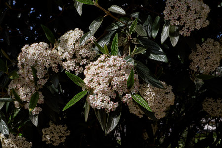 Close-up of the white flowers of the Wayfaring tree (Viburnum lantana) in springtime.