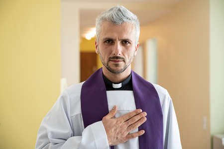 Priest cleric praying with his hand on heart