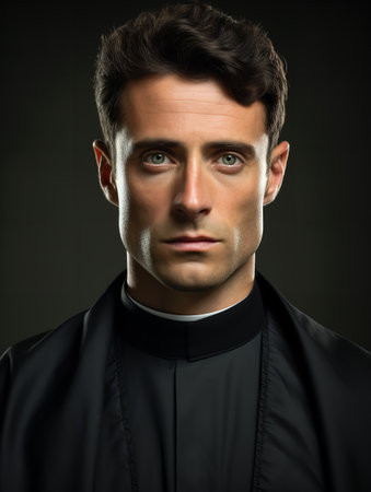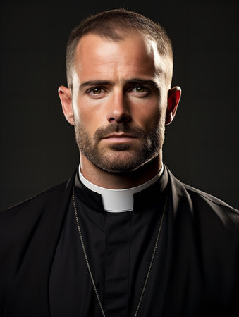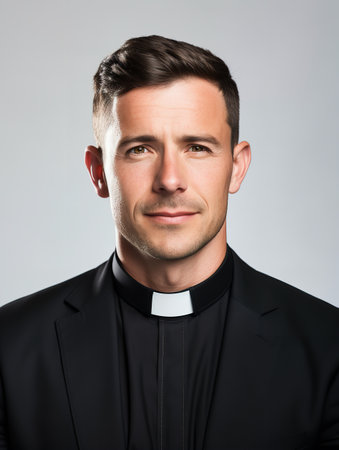 Close up portrait of a priest in black shirt with white collar against a blurred background