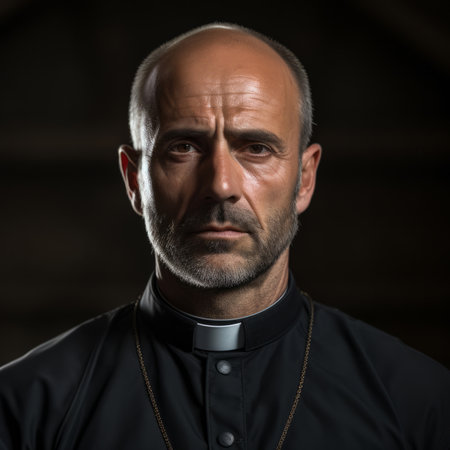 Portrait of catholic priest looking at camera in dark church.