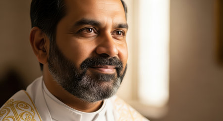 Portrait of a smiling African American Catholic priest in robes