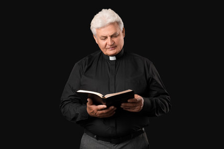 Senior priest reading Holy Bible on dark background