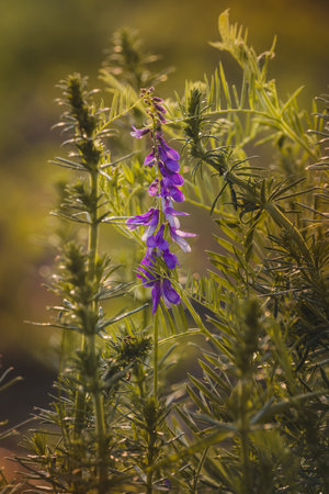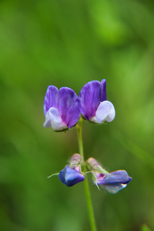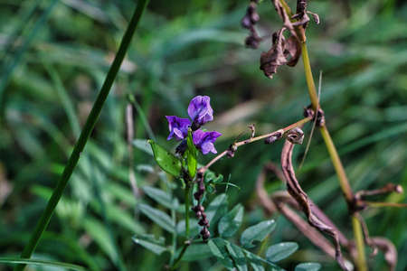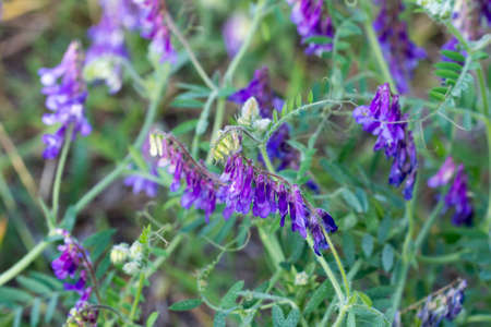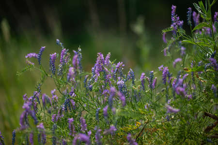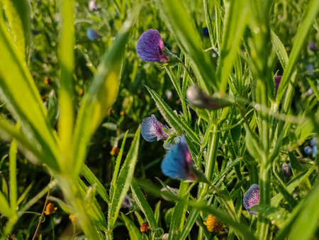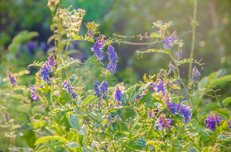 Wild elegant plants and herbs of the forest meadow. Grass mouse peas with blue purple flowers.