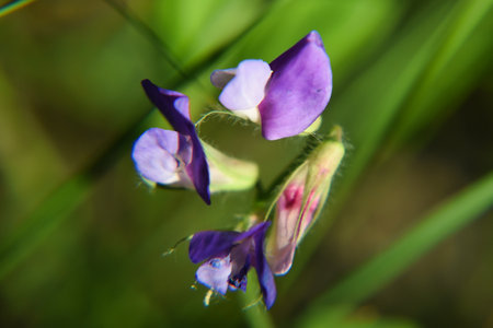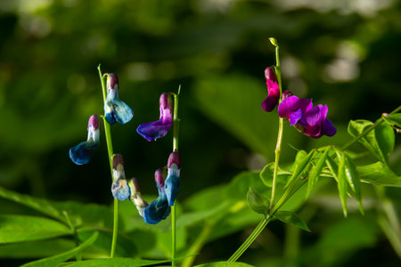 Lathyrus vernus in bloom, early spring vechling flower with blosoom and green leaves growing in forest, macro.