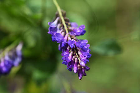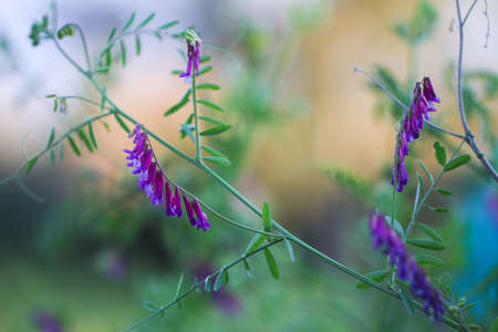 Fragile purple flowers background. Woolly or Fodder Vetch, Vicia villos, blossom in spring garden.