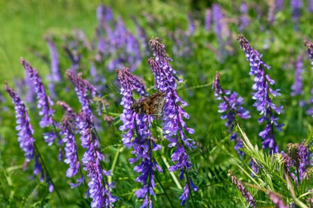 Vicia villosa, the hairy vetch violet flowers in meadow closeup selective focus