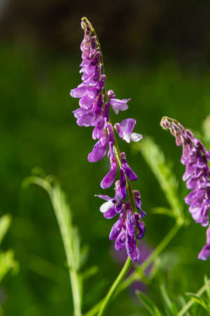 Purple flowers of hairy vetch vicia villosa on sunny summer day